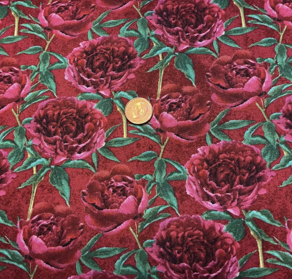 Vinrött tyg med blommor
